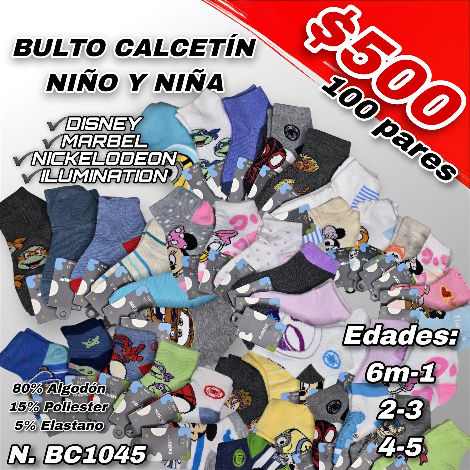 Surtidos en tallas y personajes animados de Disney, Marvel, Nickelodeon etc.